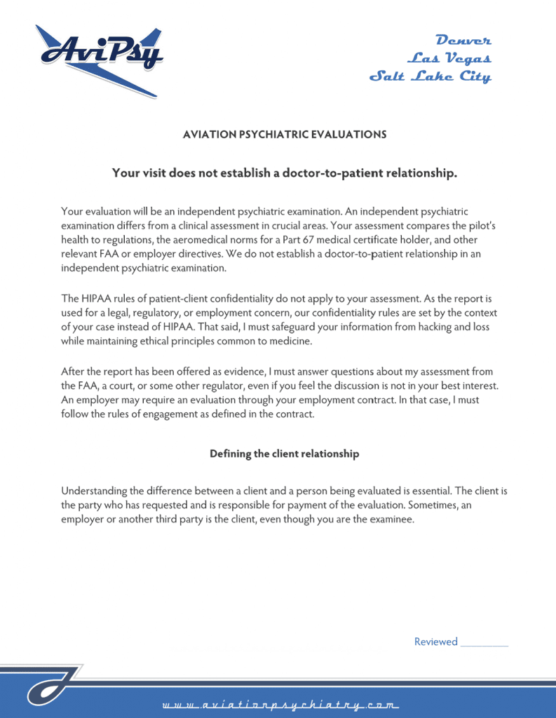 The disclosure describes how an aviation psychiatry evaluation differs from a clinical examination. The disclosure also tells you how we manage the report, who gets copies, and other vital information you want to know.